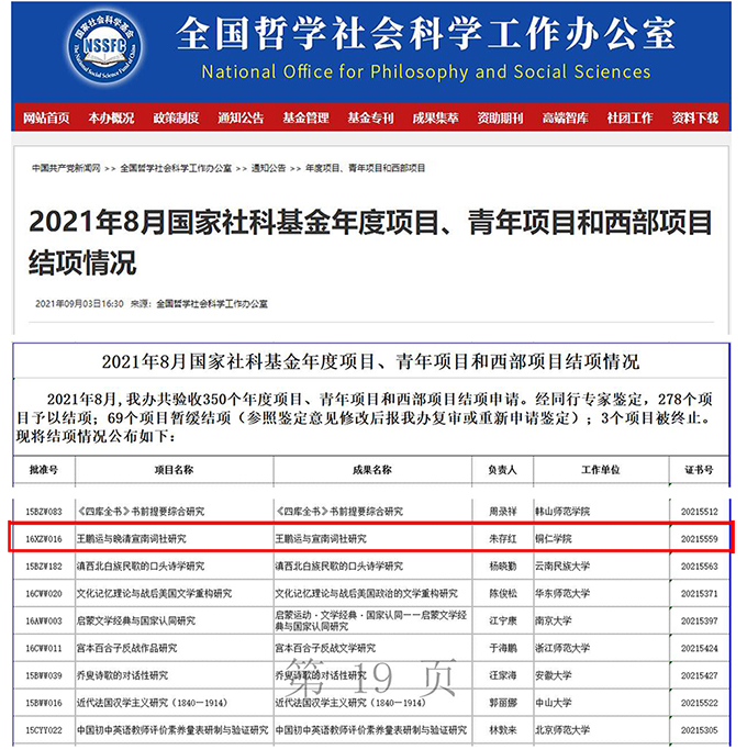 近日,从全国哲学社会科学工作办公室网站获悉,我校人文学院三级教授朱存红主持的国家社科基金项目《王鹏运与晚清宣南词社研究》(证书号20215559)喜获结项。