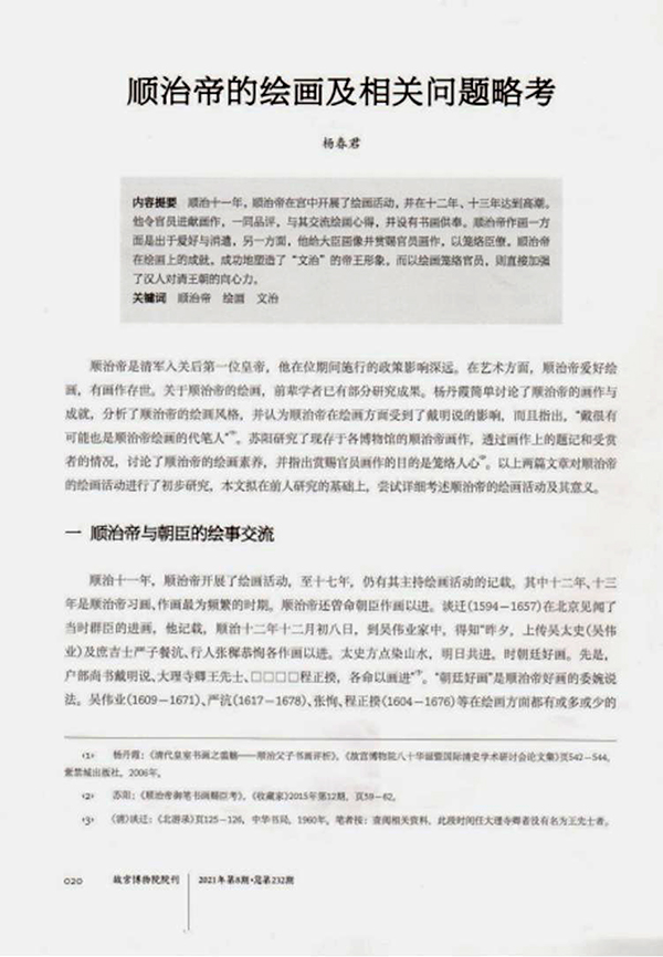 近日获悉,我校人文学院历史系杨春君博士在《故宫博物院院刊》2021年第8期上发表了题为《顺治帝的绘画及相关问题略考》的论文。该刊系考古学CSSCI刊物。