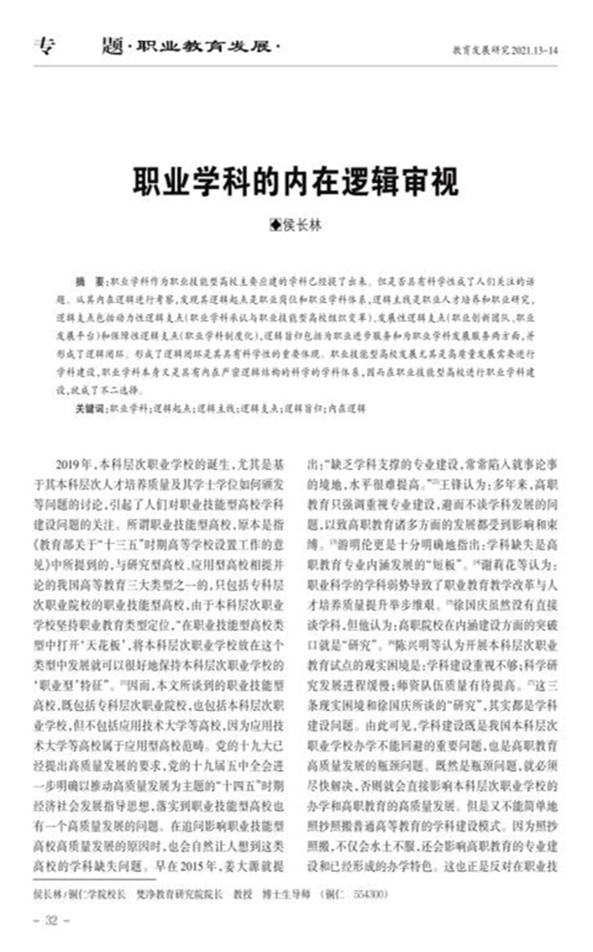 近日,我校校长、二级教授、教育学博士侯长林独著的论文《职业学科的内在逻辑审视》发表于教育类一级期刊《教育发展研究》2021年第13-14期。该论文有11000余字,是继《本科层次职业学校学科选择及建设策略——兼论职业学科》《本科职业教育有必要抓学科建设吗?——论职业学科建设的价值意蕴》等文章之后关于职业学科研究的最新成果。该文研究内容具有创新性、研究领域具有开拓性,同时也凸显了我校哲学社会科学的原创能力和社会影响力。