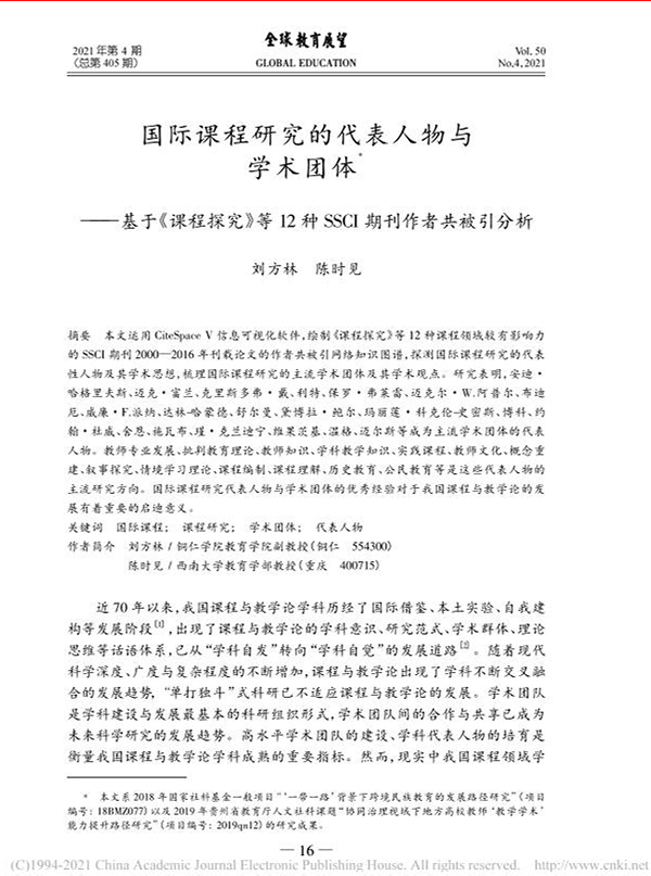 近日,我校教育学博士刘方林副教授的论文《国际课程研究的代表人物与学术团体》发表于教育类一级期刊《全球教育展望》2021年第4期。该论文15000余字,是继2018年发表于顶级期刊《教育研究》上的论文《比较教育的价值构建与主题选择》及2019年发表于一级期刊《外国教育研究》上的论文《方法论视域下比较教育发展的基本路径》等之后关于比较教育研究的最新成果。该论文研究视角独特,研究方法创新,呈现了国际课程研究的人物图像与学术思想。该论文被外审专家评价:“研究思路清晰,内容充实,显示了作者扎实的学术功底和严谨的学术态度。”