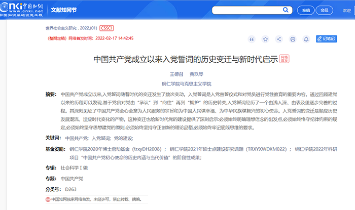 近期,我校马克思主义学院王德召教授和黄玖琴教授合著的论文《中国共产党成立以来入党誓词的历史变迁与新时代启示》一文,发表于人文社会科学学术理论重要期刊《世界社会主义研究》2022年第1期。该文是作者承担的铜仁学院2021年硕士点建设课题和铜仁学院科研课题的阶段性研究成果。该文对中国共产党成立以来入党誓词的变迁历程进行系统梳理的基础上,提出了入党誓词变迁的新时代启示,研究内容具有一定的创新性,研究结论对于推动新时代党员教育具有一定的借鉴价值。