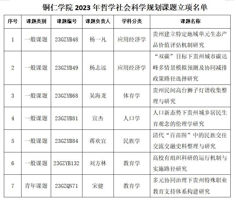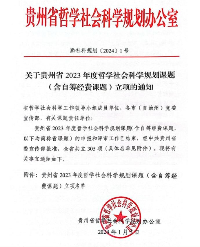 2024年1月,贵州省哲学社会科学规划办公室《关于贵州省2023年哲学社会科学规划课题(含自筹经费课题)立项的通知》正式下文。我校7项课题获得立项,其中一般课题6项、青年课题1项,申报立项率达35%,立项数量创学校历史新高。这既展现了学校教师在科学研究上的积累与实力,又彰显了学校在服务我省重大战略的科研实力,为我校的硕士点建设与博士点授权单位申报工作进一步奠定了基础。新的一年,期盼学校广大教师秉持“砥志研思新征程、笃行致远再出发”的学术理想,为个人和学校的发展创造更加辉煌的成就。