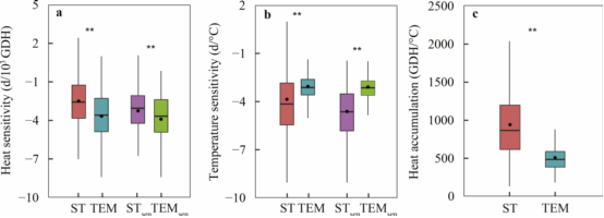 亚热带与温带木本植物展叶始期温度敏感度和热量累积的差异性对比