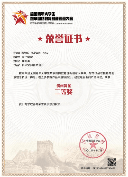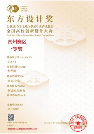 我校艺术学院美术与设计系教师滕明勇教授,2024年在多项全国性设计竞赛中获奖。8月,滕明勇教授的设计作品《遇见·空间》《深蓝世界》《毕业影响》分别获得全国高校创新设计大赛组委会举办的“东方设计奖”一二三等奖。9月,设计作品《智联和平盾空间站设计》获得东方创意之星设计大赛组委会举办的东方创意之星主题设计赛三等奖。12月,两组设计作品《空天卫士系列》《和平空间基站设计》都获得中国信息协会举办的“全国青年大学生数字国防教育创新创意大赛”教师组贵州赛区二等奖,《空天卫士系列》部分作品还进入全国决赛并获得三等奖。