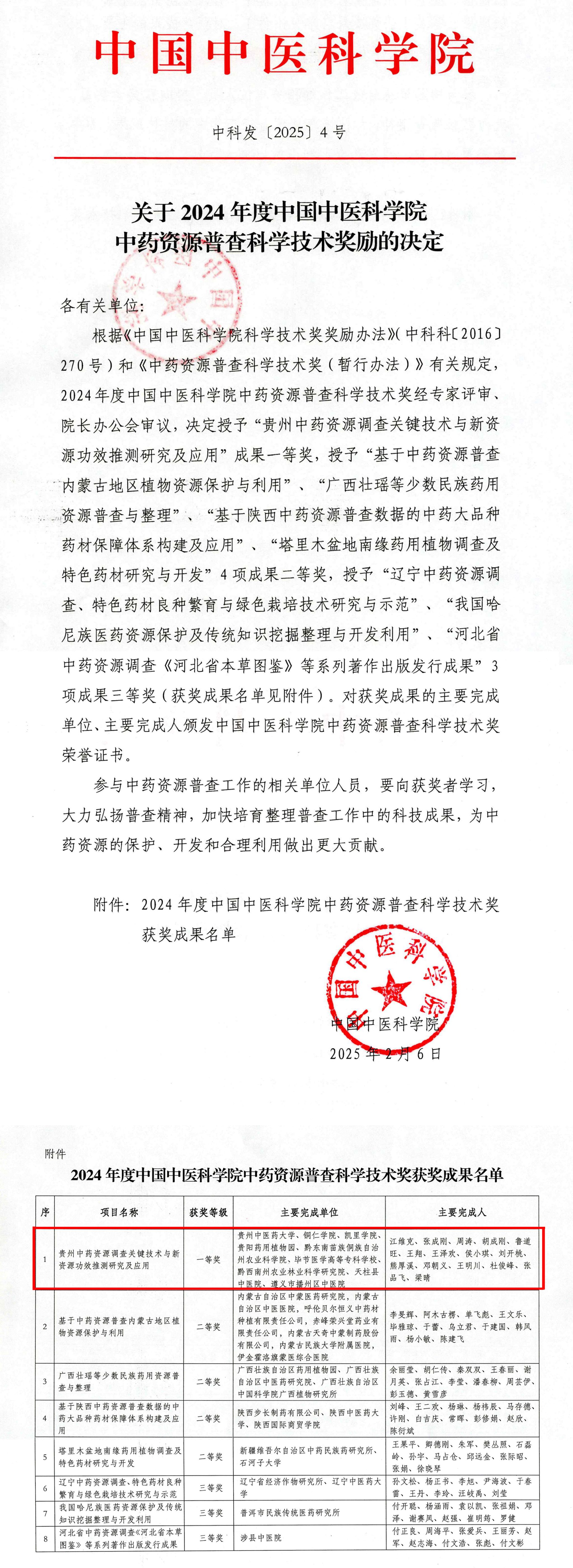 近日,中国中医科学院发布《关于2024年度中国中医科学院中药资源普查科学技术奖励的决定》,由贵州省中药资源普查技术依托单位贵州中医药大学联合我校等多家单位共同申报,我校教师鲁道旺等人主要完成的项目“贵州中药资源调查关键技术与新资源功效推测研究及应用”,荣获2024年度中国中医科学院中药资源普查科学技术奖一等奖。