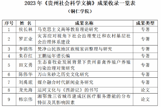 近日,我校收到由贵州省社科联主编的《贵州省社会科学文摘(2023)》,我校侯长林等9位教师的学术成果被《贵州省社会科学文摘》收录。这一成绩不仅是对老师们学术努力的高度认可,也是我校学术领域影响力提升的重要标志。