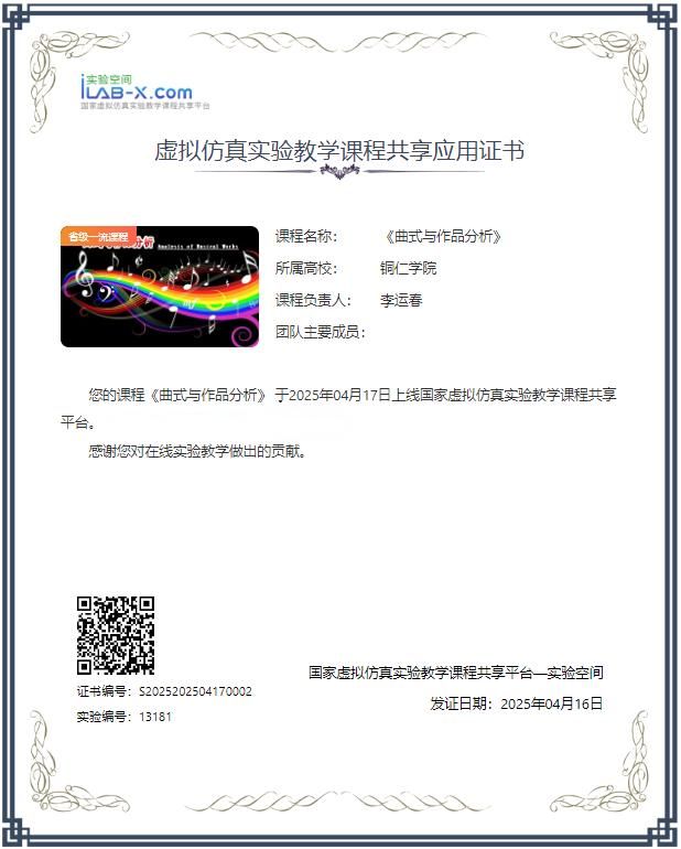 近日,我校艺术学院李运春博士主持建设的省级一流课程《曲式与作品分析》成功入驻“实验空间ilab-x”国家虚拟仿真实验教学课程共享平台,成为贵州省首个登陆该国家级平台的音乐类虚拟仿真课程。