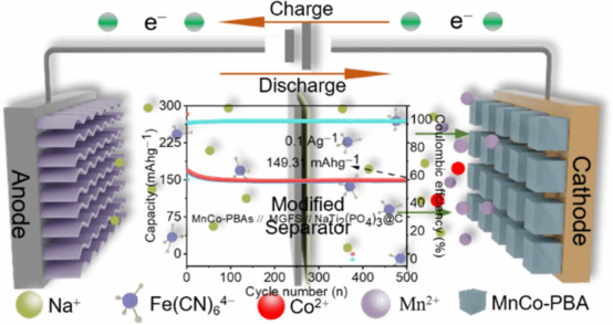 为了解决上述科学难题,近日铜仁学院石维校长和杨应昌教授带领的先进能源材料与器件课题组陈静博士,合成了高性能的Mn-Co基普鲁士类材料(Na1.74Mn0.88Co0.12Fe(CN)6·2.37H2O,MnCO-PBA),并结合一种由Na4Fe(CN)6改性的玻璃纤维隔膜修复技术,提出了一种新型水系钠离子电池体系改进方案。在全电池系统中,Fe(CN)64–作为功能基团不仅可以捕捉循环过程中形成的Mn、Co离子,而且还可以填补MnCO-PBA普鲁士蓝阴极材料表面的Mn、Co离子空位。借助于Na4Fe(CN)6添加剂的引入,高浓度电解质中自由水的自分解效应可以得到有效降低。由MnCo-PBA阴极、自修复隔膜和NaTi₂(PO₄)₃@C阳极组成的水系钠离子电池体系,在0.05 A g⁻¹下实现了101.35 Wh kg⁻¹的比能量密度,并在0.2 A g⁻¹下循环5000次后仍保留了85.82%的放电容量。此外,该改性隔膜修复技术成功应用于软包电池,在0.1 A g⁻¹下实现了151.27 mAh g⁻¹的高初始比容量,并在500次循环后保留了98.7%的容量。该方法为大规模和安全储能系统的开发开辟了新的前景。