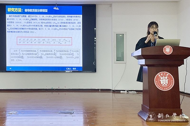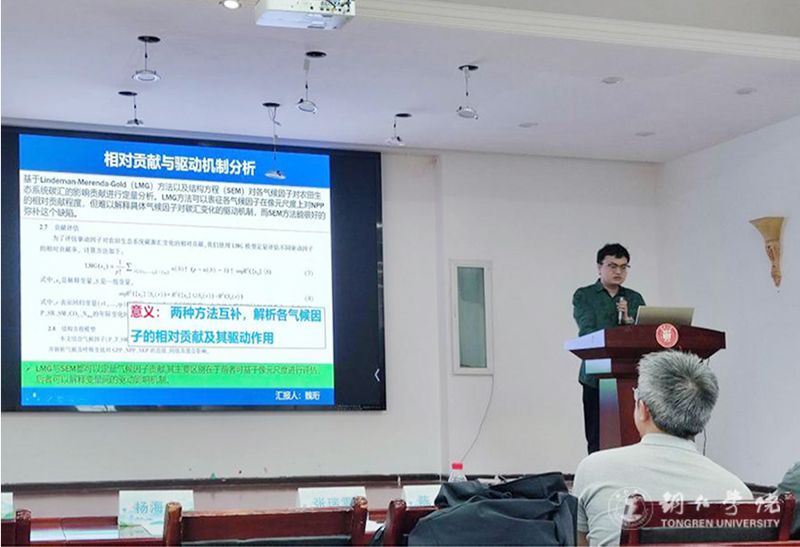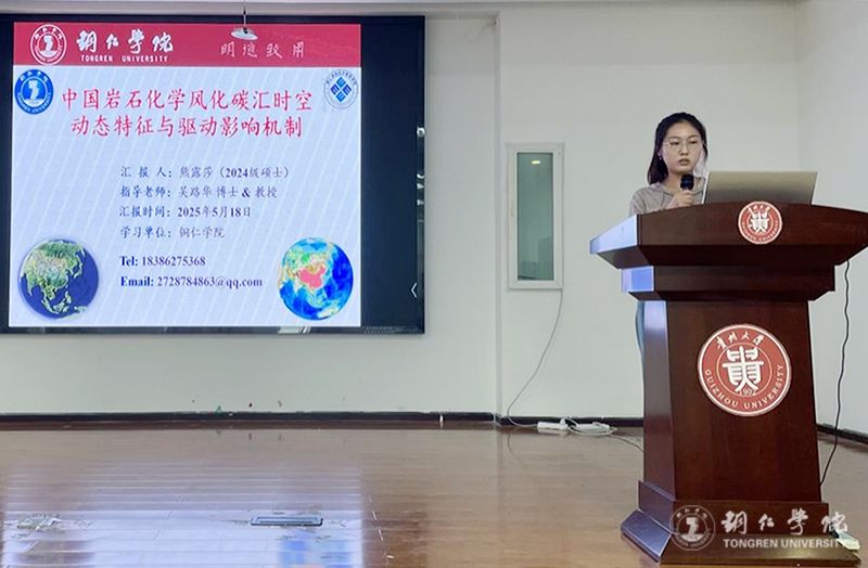 会上,魏珩、陈丹、熊露莎同学于分论坛作学术报告。魏珩同学以《气候变化下全球农田生态系统碳源汇演变特征》为题,基于多源遥感数据与模型模拟,揭示了全球农田碳汇对气候变化的响应特征,为农业碳中和策略优化提供了科学依据;陈丹同学在《气候变化主导中国植被碳汇增长而非人类活动》报告中,通过长序列遥感数据分析,提出气候变化对植被碳汇的驱动效应显著高于人为干预的结论,为生态政策制定提供了新视角;熊露莎同学聚焦地质碳汇前沿领域,在《中国岩石化学风化碳汇时空动态特征与驱动影响机制》报告中,揭示了中国岩石化学风化碳汇的量级规模、时空分布格局及气候变化因子对其贡献率。