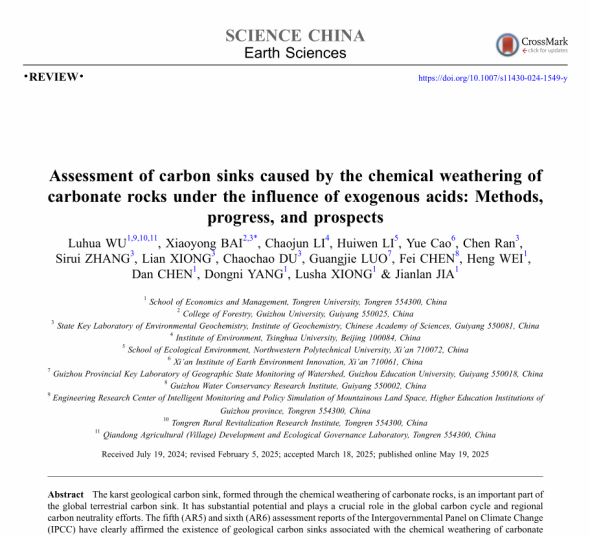 5月19日,我校经济管理学院吴路华教授在国际权威期刊《Science China Earth Sciences》和《中国科学:地球科学》(中科院1区Top SCI,IF=6)同时在线发表题为《Assessment of carbon sinks caused by the chemical weathering of carbonate rocks under the influence of exogenous acids: Methods, progress, and prospects》与《外源酸作用下碳酸盐岩化学风化碳汇评估:方法、进展与展望》的2篇研究论文。该论文一刊双版(中文版与英文版),由吴路华教授作为唯一第一作者,中国科学院地球化学研究所白晓永研究员为唯一通讯作者,联合贵州大学、清华大学、西北工业大学等多家科研机构共同完成。