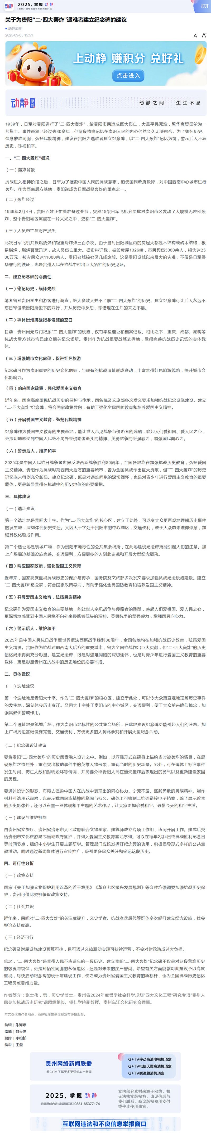 2025年是中国人民抗日战争暨世界反法西斯战争胜利80周年,全国各地均在加强抗战历史教育,弘扬爱国主义精神。贵阳作为抗战时期西南大后方的重要城市,曾为全国抗战作出巨大贡献。