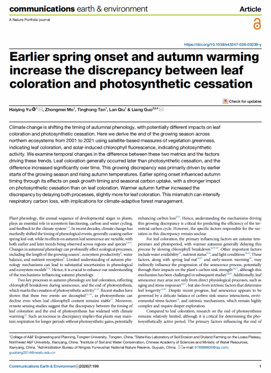 近日,我校于海英博士在《Communications Earth & Environment》发表了题为“Earlier spring onset and autumn warming increase the discrepancy between leaf coloration and photosynthetic cessation”的研究论文。我校系论文第一署名单位,于海英为第一及通讯作者,莫忠妹、谭廷鸿和邱岚共同参与了本项研究,西北农林科技大学郭梁教授为共同通讯作者。